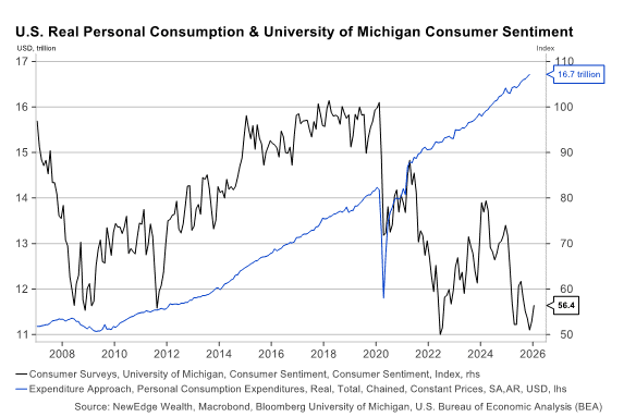 That pulls sentiment readings down even while spending stays elevated.