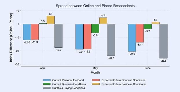 Economists Ernie Tedeschi and Ryan Cummings have pointed out that sentiment surveys experienced a structural break when data collection shifted from phone interviews to online responses. People tend to be more negative when responding online than when speaking to another person.