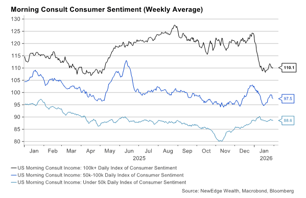 As of January 2026, sentiment among higher-income households has also turned lower. At the same time, sentiment among lower-income households has improved modestly since November 2025, likely tied to the resolution of the government shutdown.