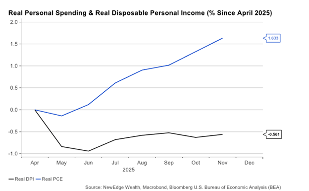 Since April 2025, real consumer spending has increased about 1.6 percent. Over the same period, real income has fallen roughly 0.6 percent. Over longer periods, these two measures tend to move together. When they diverge, something eventually adjusts.