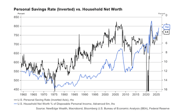The same data highlights an inverse relationship between household net worth and savings. When households feel wealthier, they tend to save less and spend more.